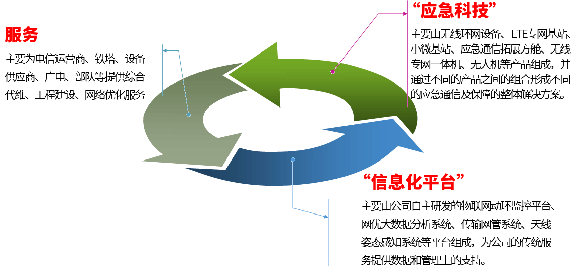 在为电信运营商、铁塔、设备供应商、广电、部队等提供综合代维、工程建设、网络优化服务的基础上, 嵌入自主研发的具有可实现应对重大通信保障活动、防抗自然灾害应急通信手段、提供运营系统平台功能的 配套特色服务,不断提升应急通信网络保障质量。具有快速、安全、可靠、稳定等特点,优于传统微波通信手段,可随时建立“空中”移动基站,通过“自组网”特点实现保障区域全覆盖,形成中富通区别于其他通信服务 商的两大特色服务即“服务+应急科技”、“服务+信息化平台”。